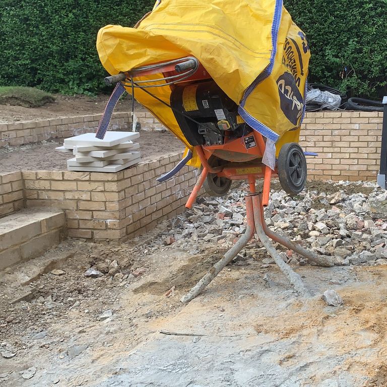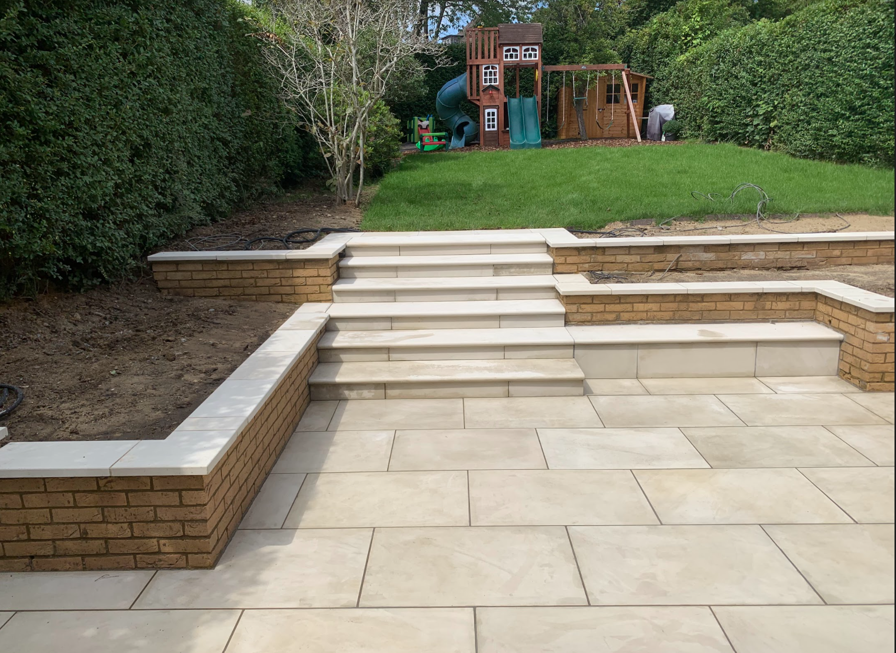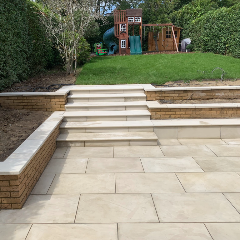 Excavated soil out of the ground to build the garden brick walls, the patio and turfed the grass area. The slabs for the patio, the coping stones on top of the brick and the bullnose patio steps made of a fluorescent white porcelain.