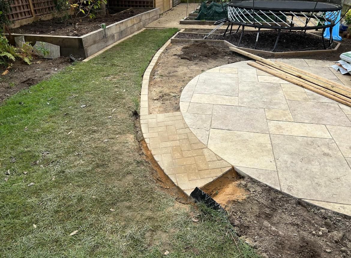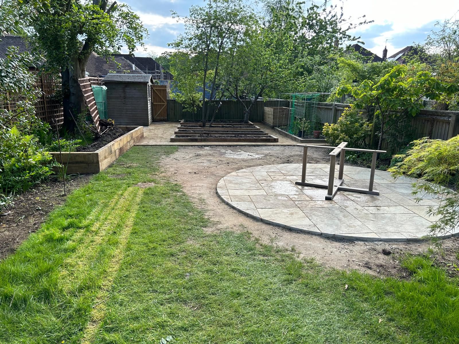 Sleepers put in, circular Abbey Limestone patio, self binding gravel path and block paving path border.